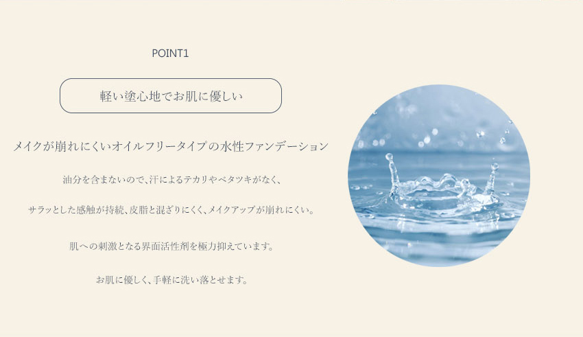 水性ファンデーションなので、お肌への刺激となる界面活性剤を極力抑えています。お肌に優しく、手軽に洗い落とせます。