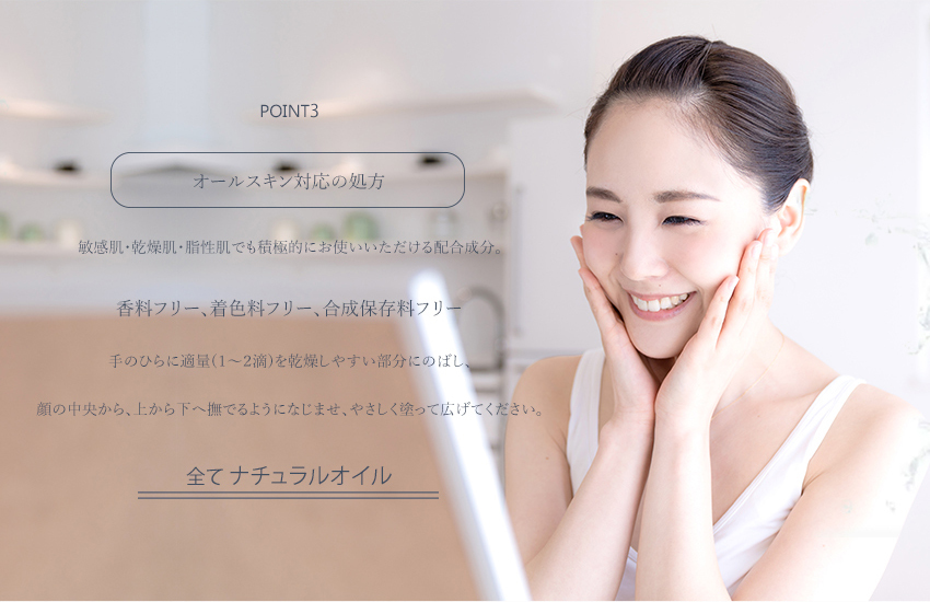 乾燥肌・脂性肌などお肌の状態に合わせ、手のひらに適量(1~2滴)を乾燥しやすい部分にのばし、顔の中央から、上から下へ撫でるようになじませ、やさしく塗って広げていきます。 商品に関するお問い合わせ・お取り扱いはこちらからご連絡ください。 お電話によるお問い合せ ページトップへ